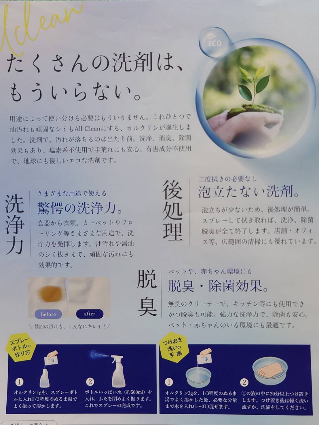 オルクリンは人にもペットにも優しい洗剤。油汚れに強く、消臭効果に優れ、除菌もでき、ペットや赤ちゃんがいる家庭にも安心してご使用になれます。